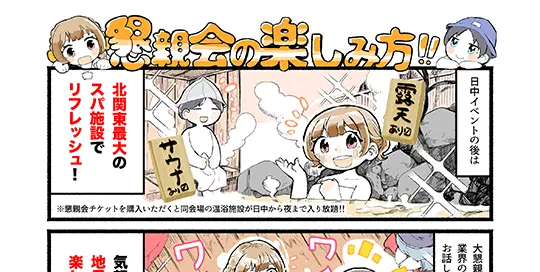 宴会場では懇親会を楽しんでいただけるだけでなく、懇親会チケットを購入いただけると同施設の温浴施設が日中から夜まで入り放題。