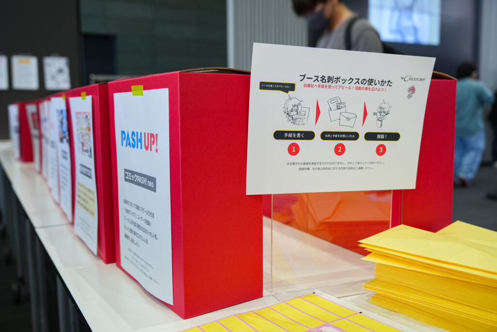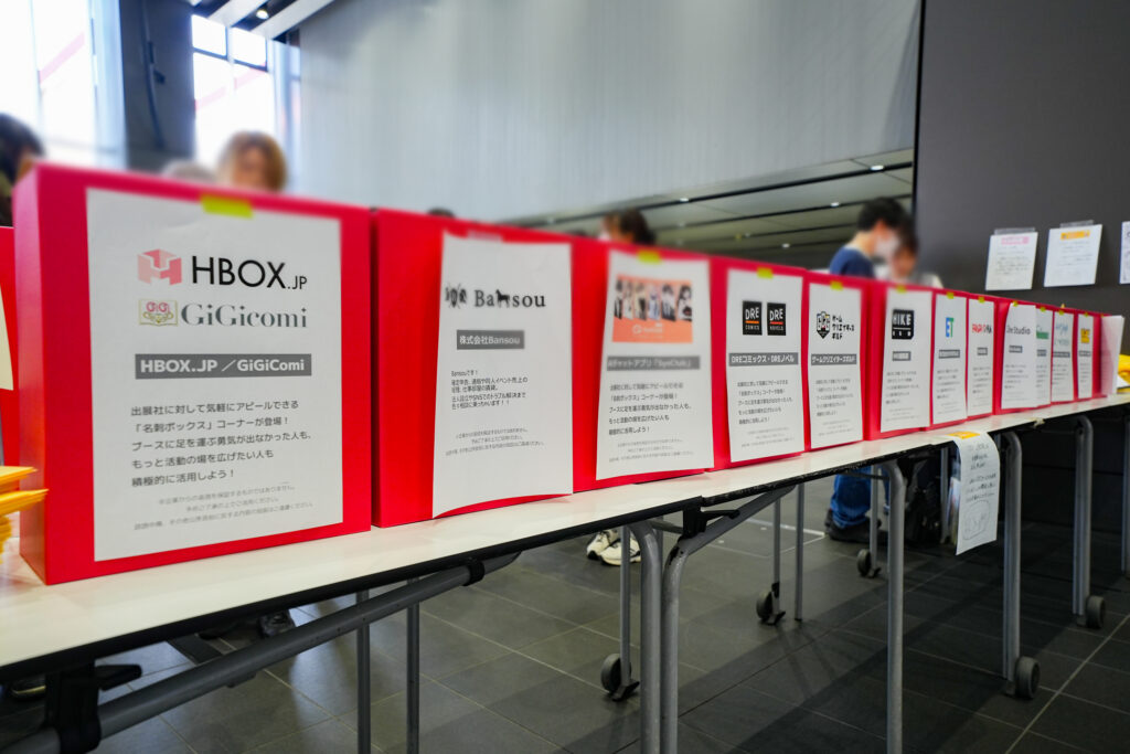 コミュニケーションに自信のない方や、時間などの関係でお話ができなかったブースにも、名刺やメッセージを送ることができるボックスを設置しました。